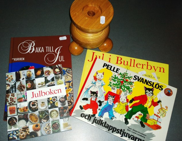 Jag är inte bara julälskare, jag är även en sann loppisfantast! Sprang inom en loppis idag som hunnit få upp julprylarna och fyndade det här. Två barnböcker med jultema, två receptböcker som ska kollas igenom efter smarriga julrecept och en gigantisk julljusstake! Alltihop för 65kr, och då var ljusstaken ”dyr” med loppismått mätt, hela 40 kronor!! 😉