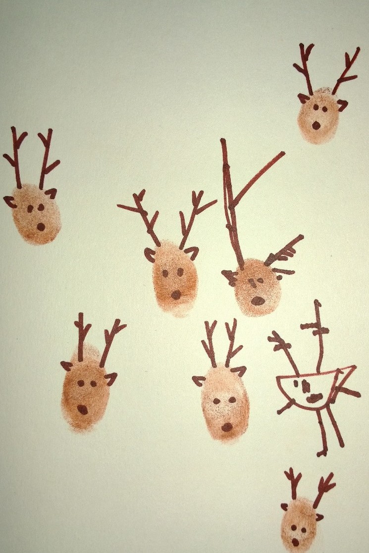 Så här såg våra julkort ut 2012, dottern har ”tummat” renar med brun färg, sen hjälptes vi åt att förse dem med ögon, öron, näsor &horn.