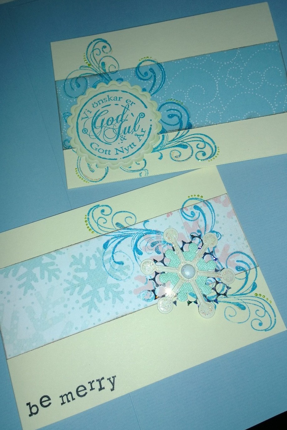 2011 blev det så här istället,, dottern var för liten för att hjälpa till och pyssla och fick bidra med sitt porträtt på insidan istället. Men korten gick i vitt, ljusblått & mintgrönt med mycket snöflingor, glitter (syns dåligt på fotot) & swirls!