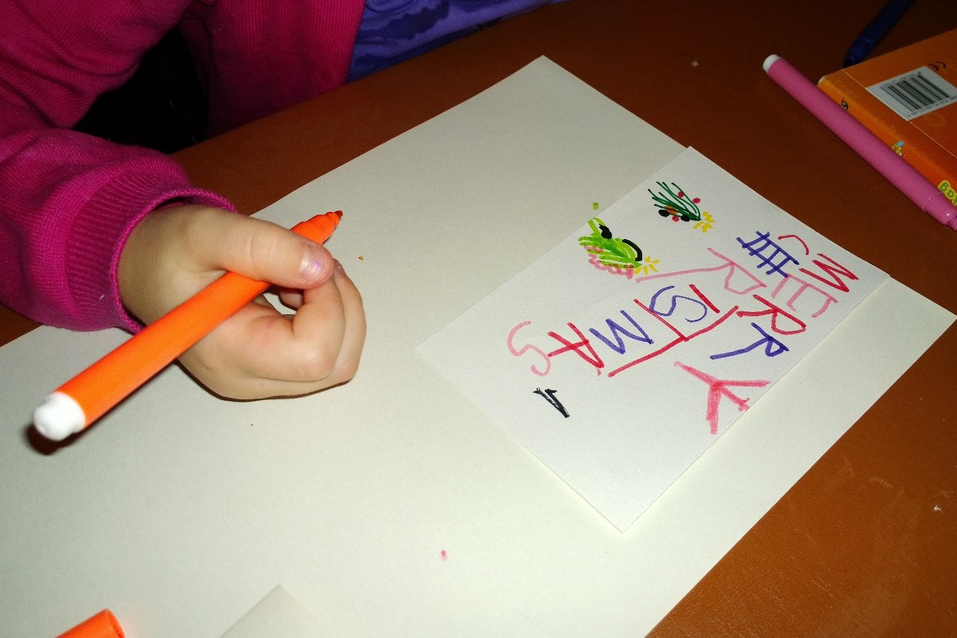 Vi har goda vänner i USA som vi brukar skicka julklapp till varje år och i år ska paketet vara postat senast på måndag för att hinna komma fram i tid, och man kan ju inte skicka julklapp utan en liten julhälsning, så igårkväll fick dottern slipa på både sin engelska och sina skrivfärdigheter!