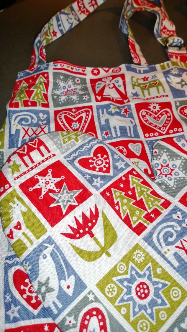 Fick ett paket på julafton innehållande detta fina förkläde med matchande grytvante från Klippan och blev så himla glad! Tycker både bilderna och färgerna är superhärliga.. 🙂