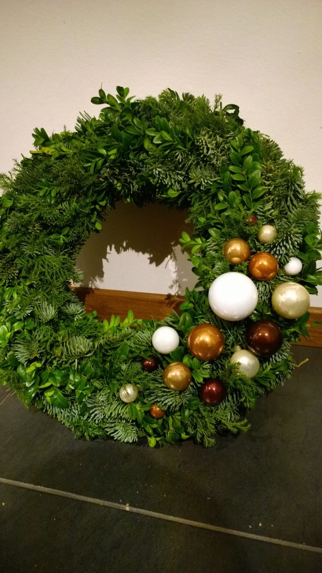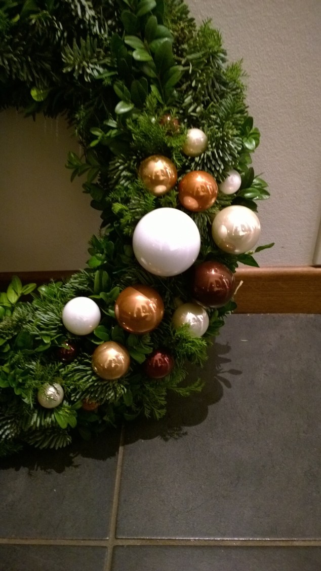 Anyhow, här kommer lite bilder på den färdiga kransen, ganska enkel, lite ”rufsig” och vild känsla med det blandade gröna men ändå lite blingig med kulorna liksom. Har däremot inte vågat hänga ut den än, är lite rädd att Sven ska blåsa bort den…