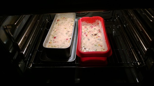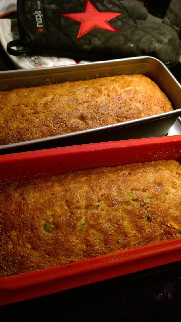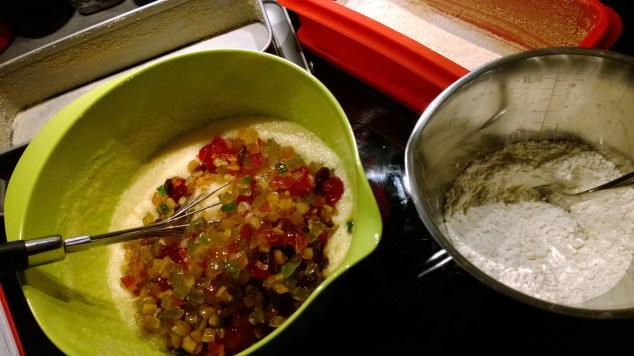 Rör 150 gram rumsvarmt smör luftigt med 2,5 dl strösocker, tillsätt fyra ägg, ett i sänder och rör runt ordentligt mellan varje. Sen är det dags för frukten, runt 4 deciliter torkad frukt. Jag använder russin, syltade apelsinskal, suckat och röda cocktailbär (som gärna har fått dra i lite rom under ett dygn eller två), men all torkad frukt ska gå bra, t ex aprikoser, fikon, katrinplommon. Sen knappt 100 gram grovt hackad mandel eller hasselnötter. Rör ner allt ordentligt i socker/smör/äggblandningen innan du tillsätter drygt 200 gram mjöl (ca 3,5 dl) och en tsk bakpulver. Häll i en (eller två) smorda och bröade bakformar.