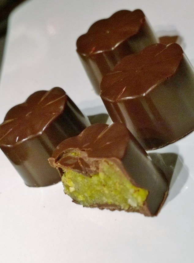 Blanda ihop 200g bra mandelmassa med 100g malda eller mixade pistagekärnor (skalade och osaltade!) och en skvätt whiskey. Forma till kulor och doppa i choklad. Eller gör som jag gjorde idag, gör praliner av dem!