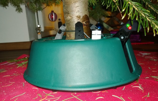 Julgransfoten är tysktillverkad och inköpt på Lidl i Danmark, för övrigt väldigt lik Krinner Comfort/Premium som jag vet att bl a Bauhaus och Conrad har i sitt sortiment. Vi har en ”snyggjulgransfot” också, syns bl a i det här inlägget, men sen vi köpte den praktiska så har den fina bara stått och samlat damm i förrådet…