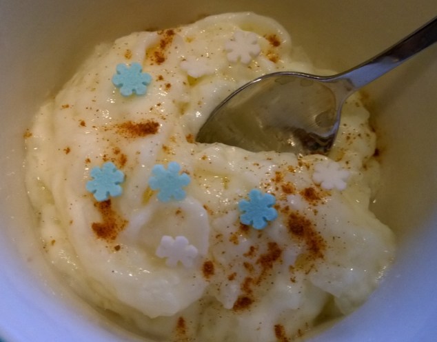 Ligger i sängen och hör hur maken och dottern småpratar med varandra i köket. Plötsligt fylls huset av julmusik! De vet precis hur de ska få upp mig ur sängen.. ❤ Och inte blev det sämre av dotterns frukostönskan; tomtegröt och glögg! Men glöggen tror jag att vi sparar tills ikväll, gröten däremot pimpade vi med några snöflingor! Det är ju trots allt fredag idag… 😉