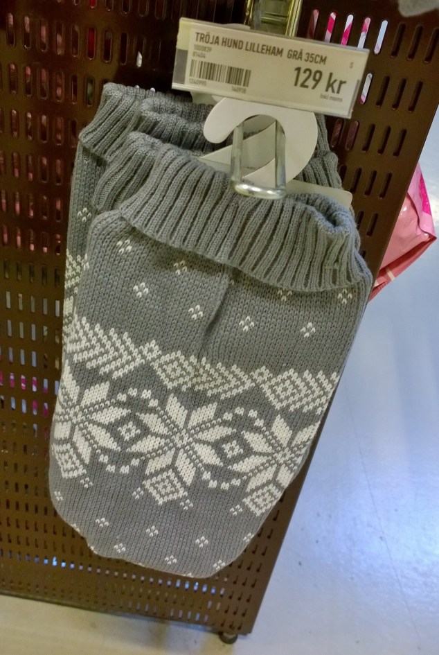 Tyvärr verkar de bara finnas till småhundar och inte till såna här bjässar som huserar hemma hos oss.. Man kanske skulle köpa sig ett ekonomipack garn och börja sticka en julklapp till honom..? 😉