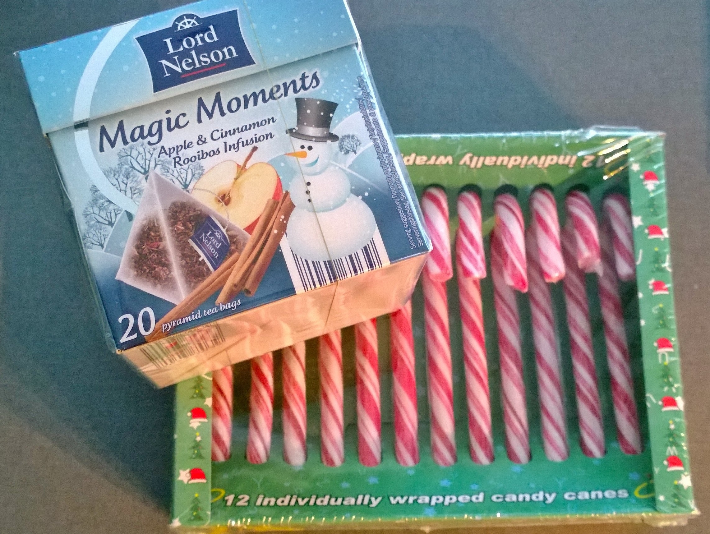 Men tröjan var inte det enda juliga jag kom hem med! Nu hade även min lokala Lidl fått hem det goda röda vinterteet ”Magic Moments” med smak av äpple och kanel och så råkade det trilla ner en ask med polkagriskäppar i vagnen också… Hoppsan! 😉
