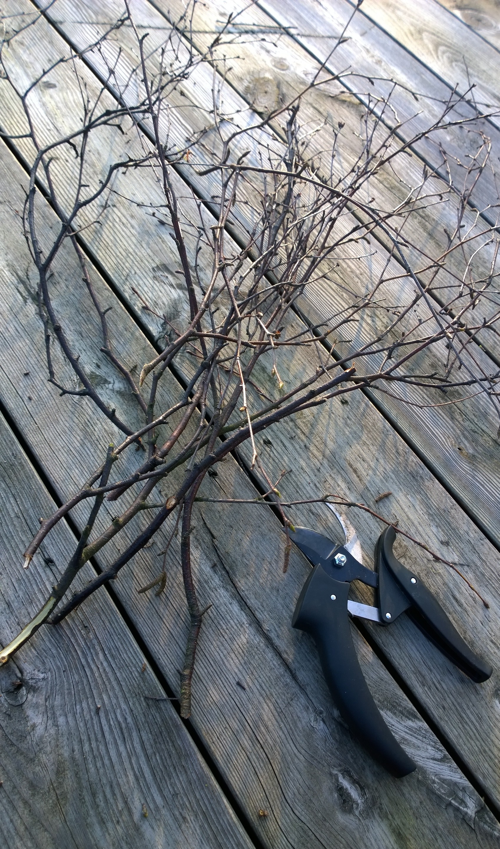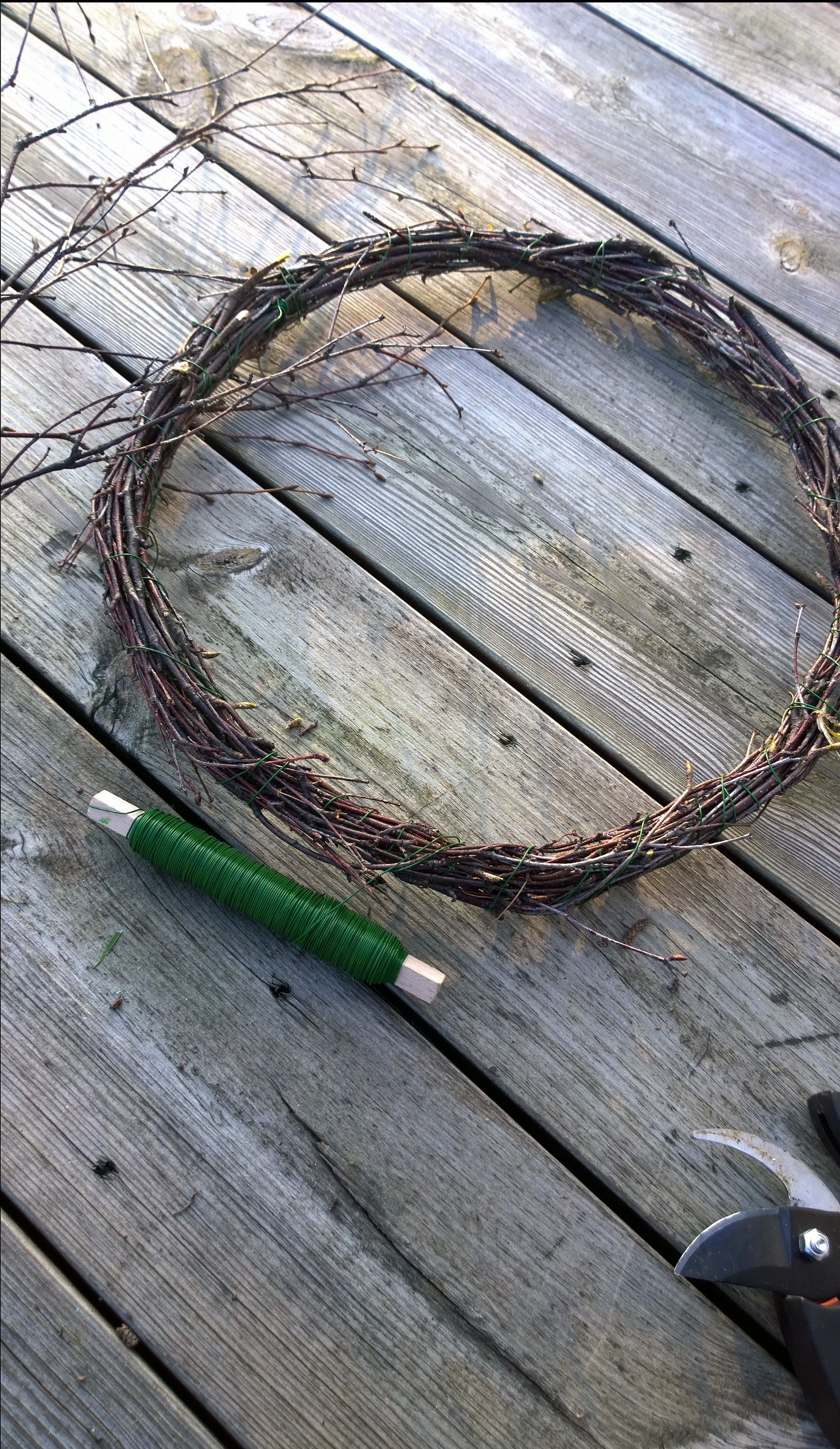 Väl hemma började jag med att sortera björkriset så jag hade lagom många mjuka, böjliga och ganska långa kvistar kvar, sen band jag dem omlott med hjälp av bindtråd tills jag hade en kransstomme i passande storlek att jobba vidare med.