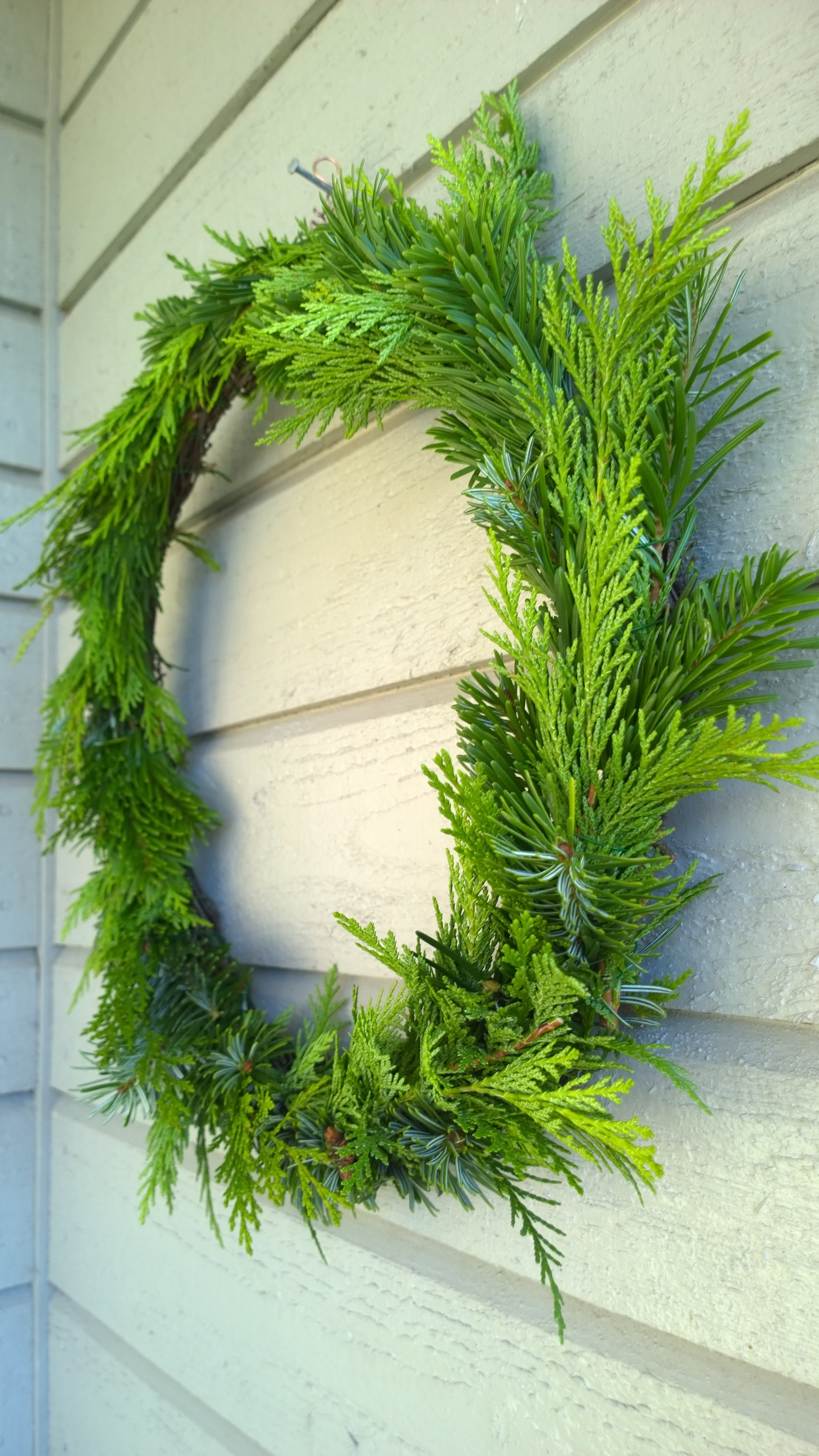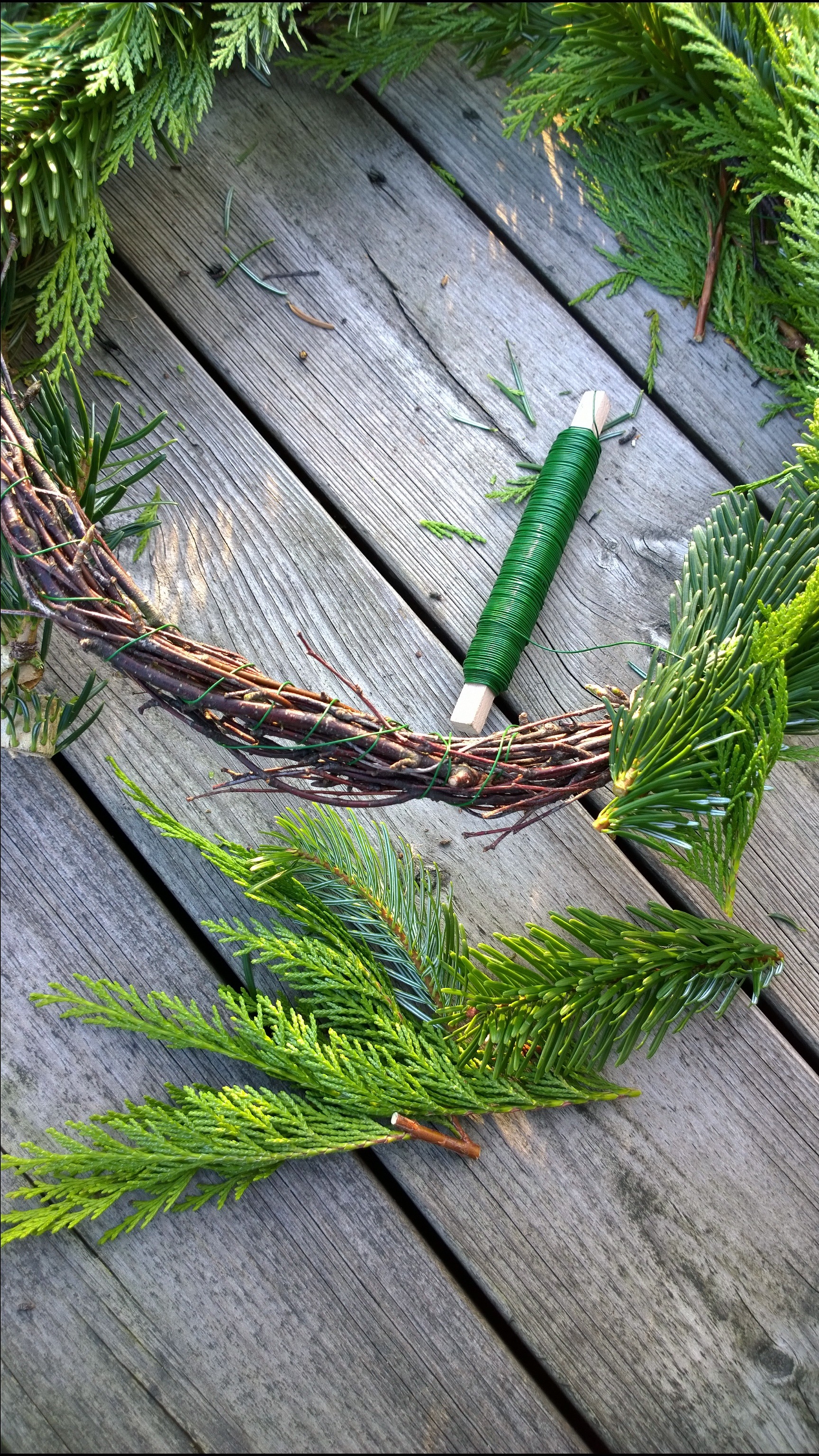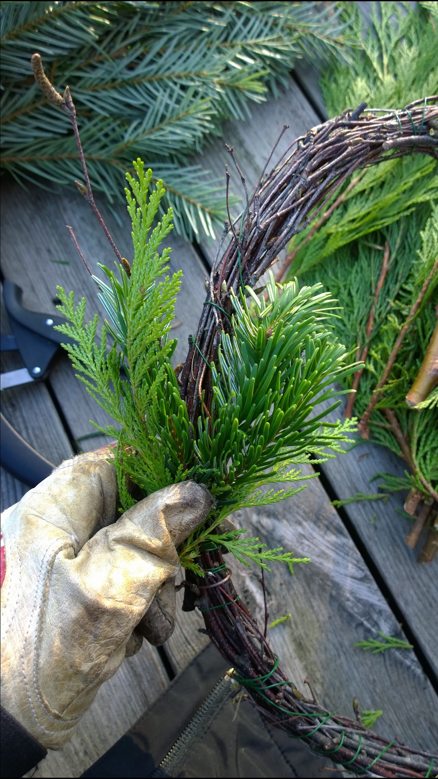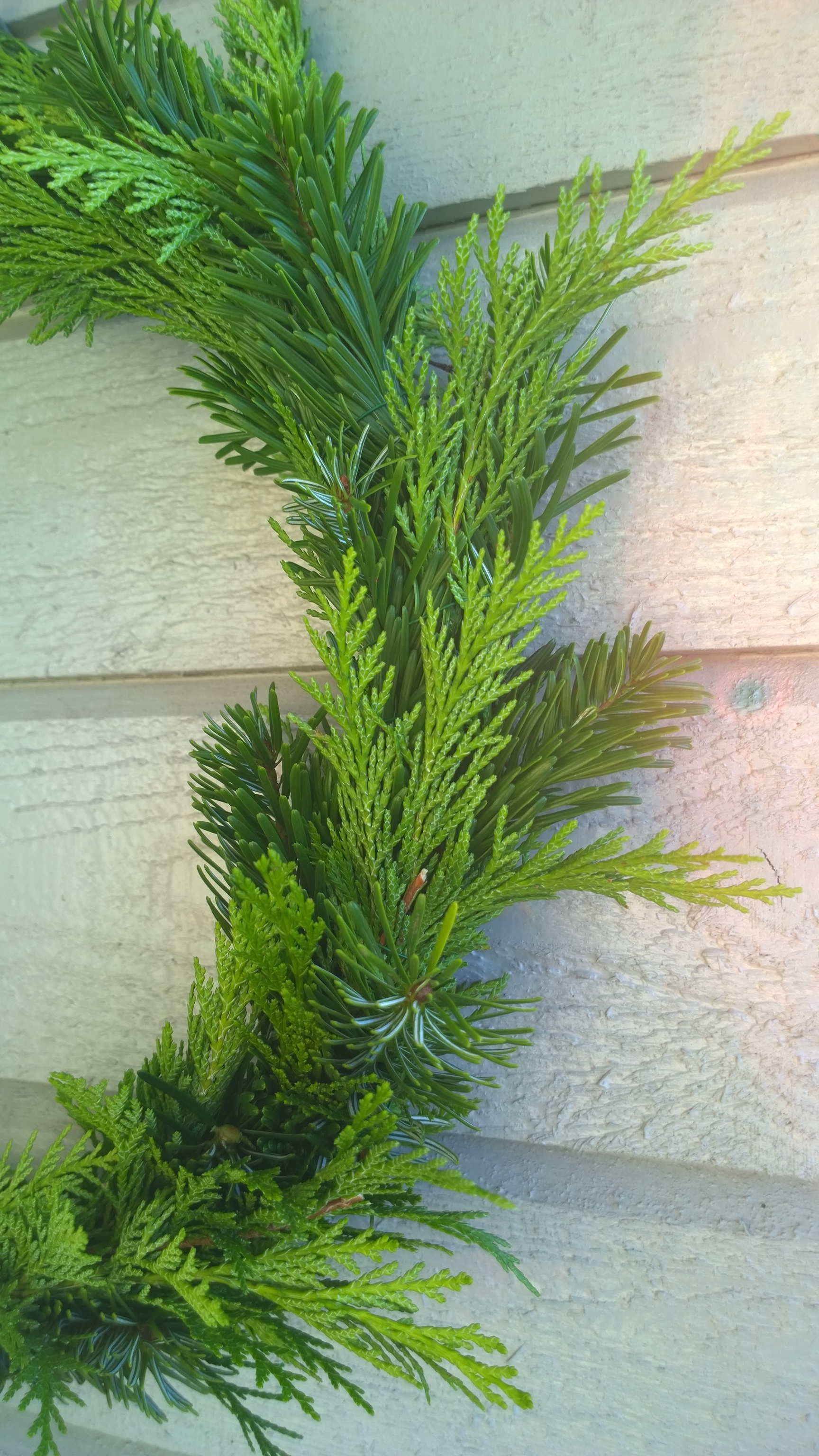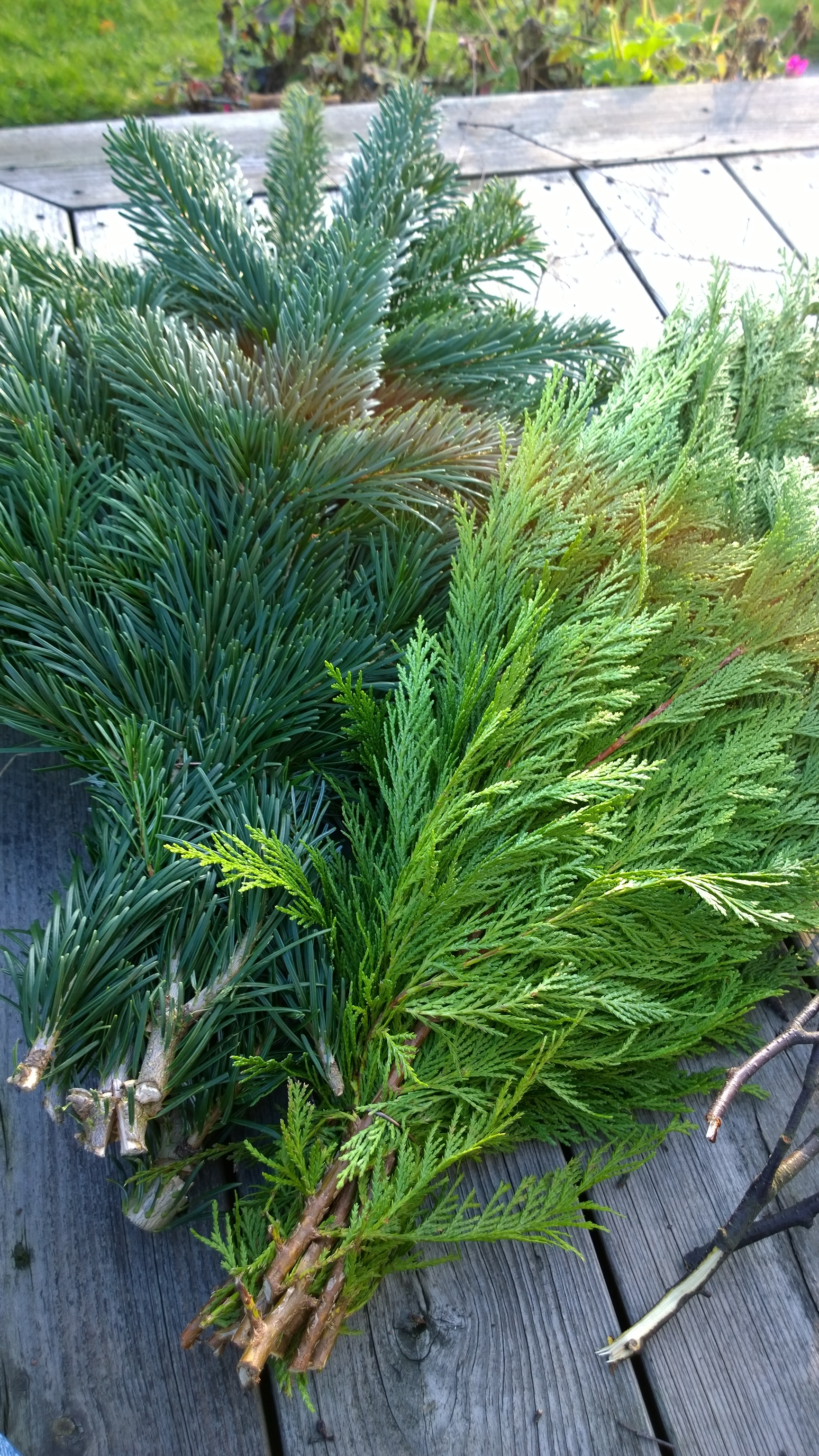 Sen var det dags att klä kransen med de två buntarna dekorationsris jag köpte senast jag var på Blomsterlandet; en bunt med cypress och en med nordmannagran, bägge är mjuka (sticks inte) och lätta att jobba med.