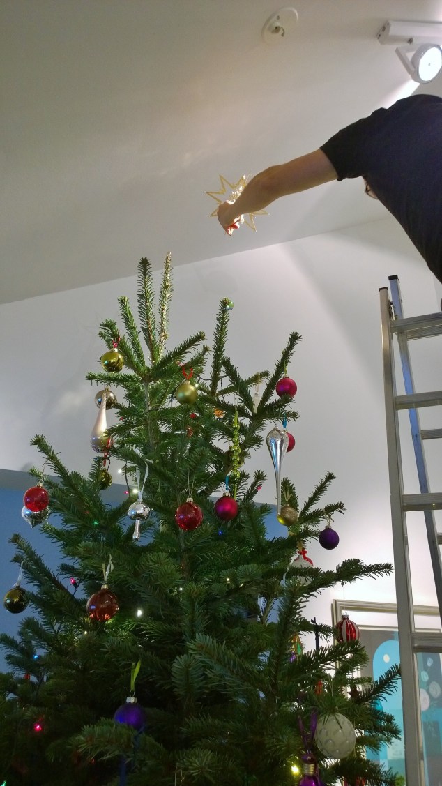 Jag vill ju egentligen dra ut på det, men i år fick jag passa på medans stegen ändå var inne.. Och den ”lilla” trappstegen nådde inte ända upp så vi fick ta in det tunga artilleriet i form av den höga stegen! Men nu är belysningen och toppstjärnan på plats, liksom kulorna som hänger längst upp. Nu kan jag dra ut lite på processen att klä den nedre halvan av granen, den delen jag når utan stege..