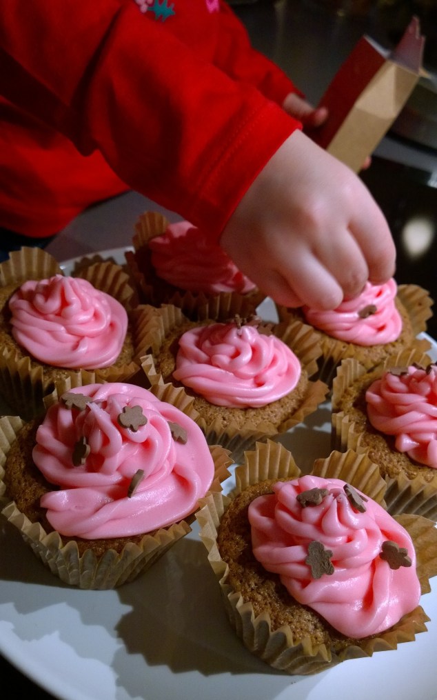 Dottern hittade ett recept i sin bakbok (eller recept och recept, hon hittade bilden) och ville baka såna! Sagt och gjort, fram med ingredienser, formar och, viktigast av allt, pepparkaksströsslet (från Lagerhaus)! Och så ville hon såklart tvunget ha rosa frosting…