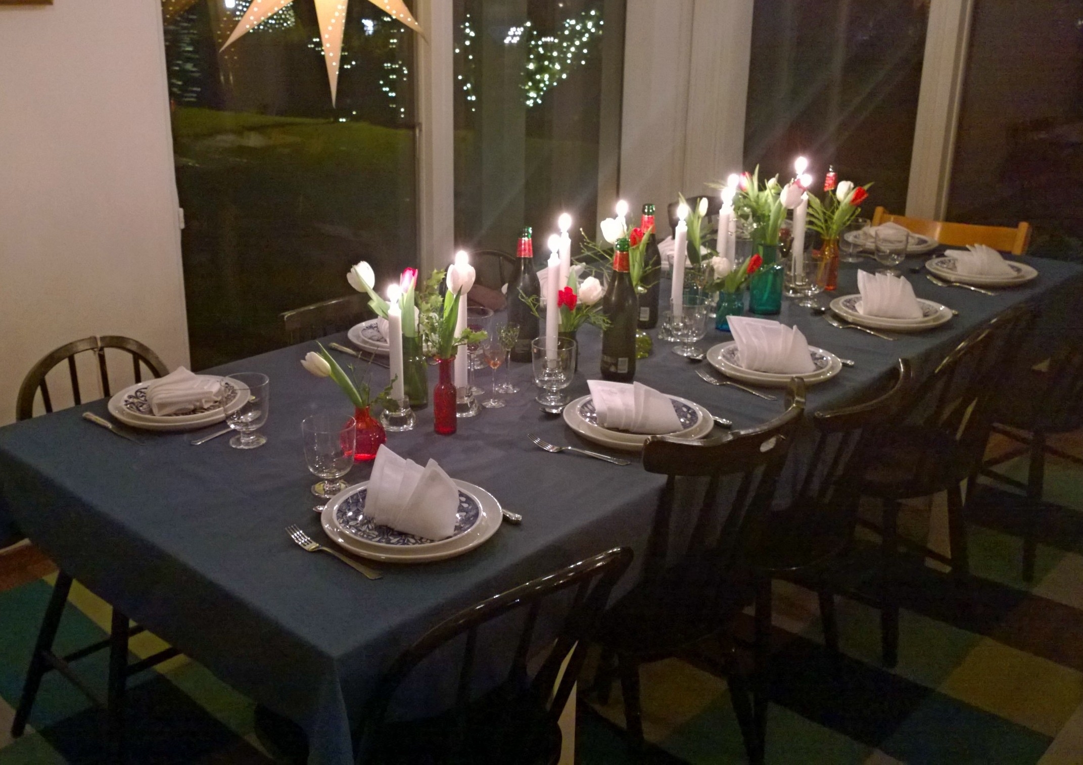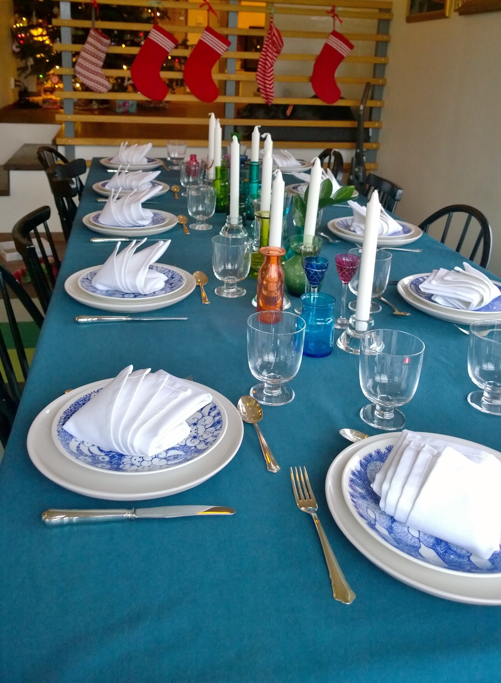 Kompletterat med en mörkt turkos duk som bas, vitt & blåvitt porslin, ärvda silverbestick, vita tygservetter, ”finglasen” på fot samt enkla glasljusstakar från Ikea så blev det rätt bra tycker jag!