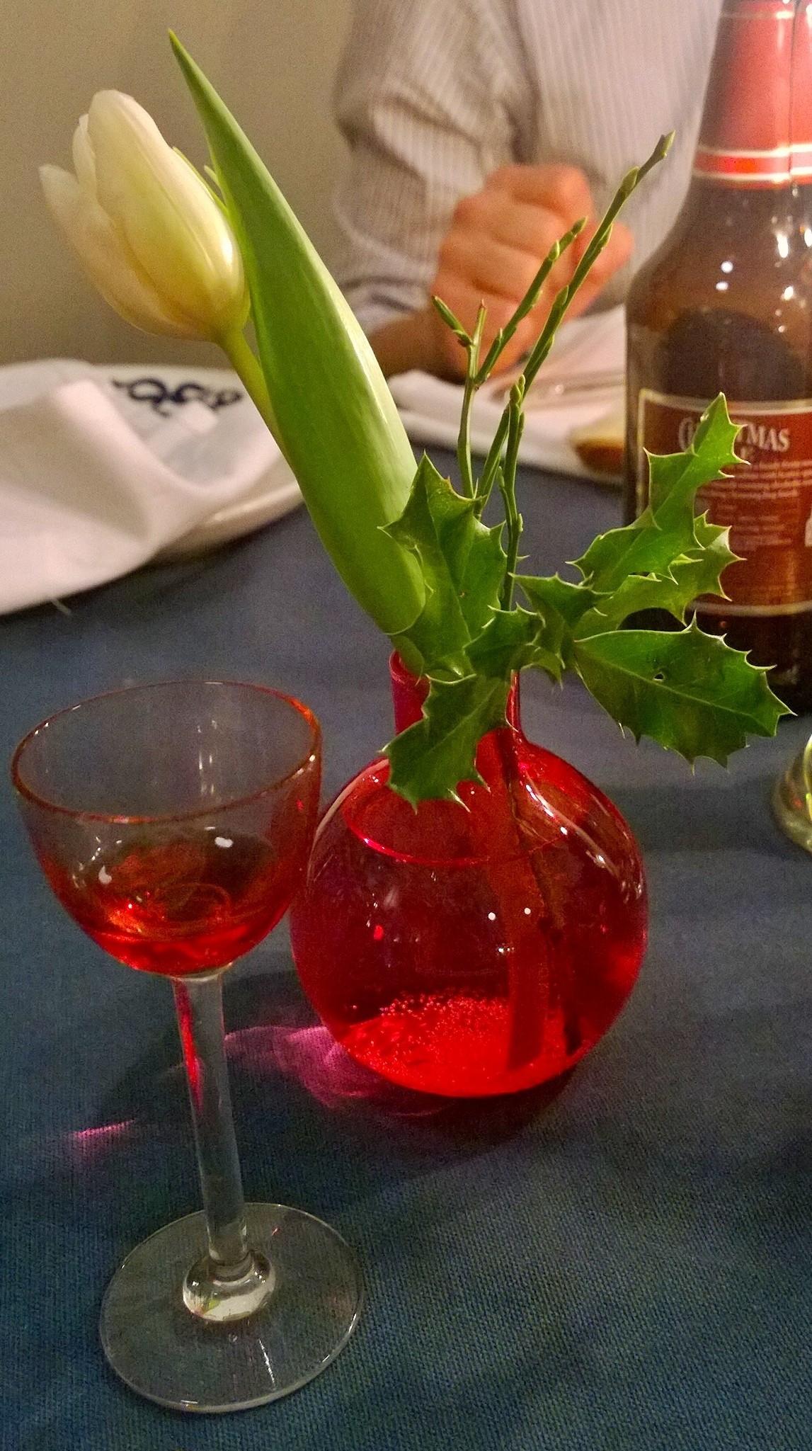 Kanske inte så juligt, men det avhjälpte jag med röda och vita tulpaner samt blandat ”juligt grönt” i vaserna; cypresskvistar, järnek och blåbärsris.