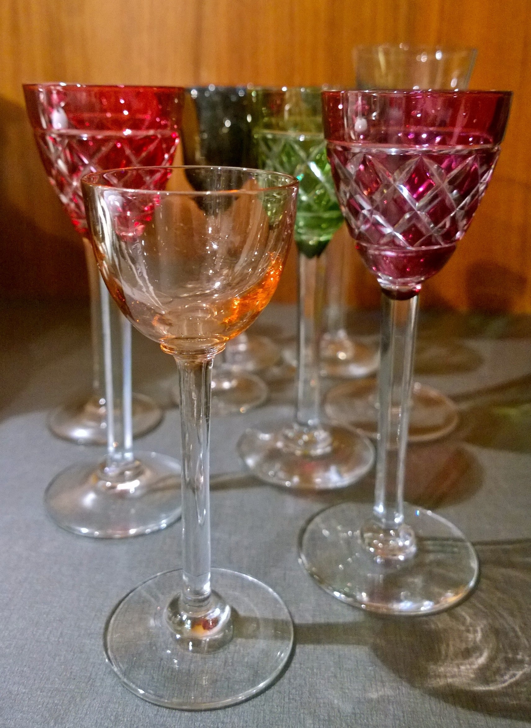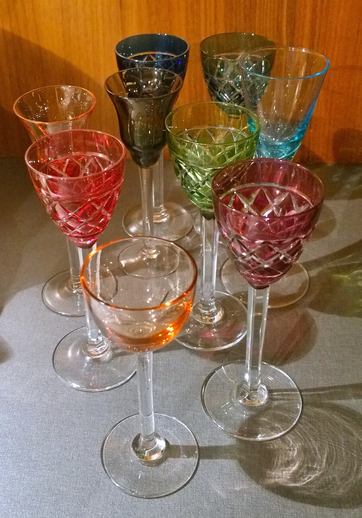Vi har en rätt fin samling udda snapsglas på fot i olika färger.