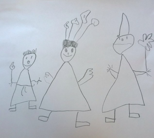 Dottern kom med det här fina luciatåget hon ritat, först kom tärnan, lucian och stjärngossen. Strax därefter pepparkaksgumman och tomtenissen!