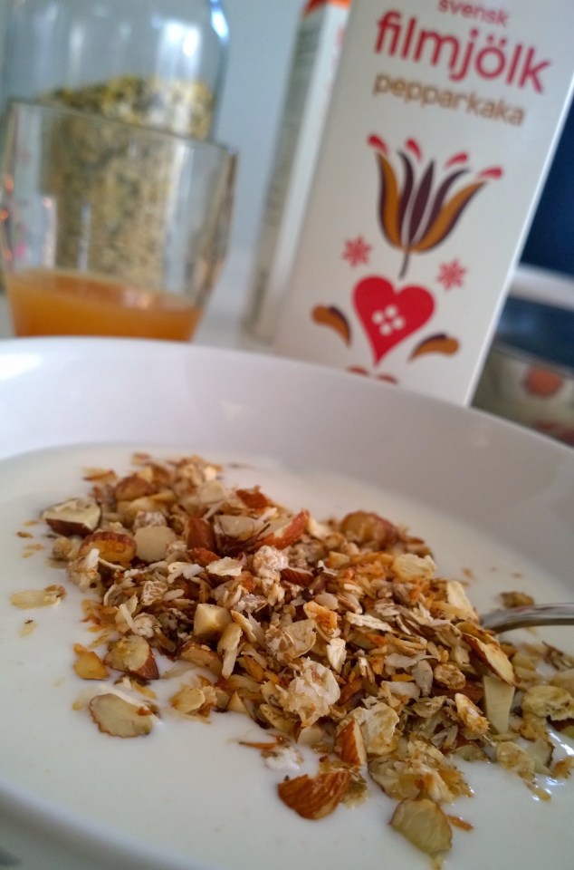 Julbordet igår var ljuvligt, nu en lätt frukost med pepparkaksfil och hemrostad müsli!