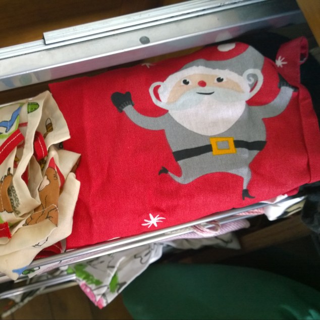 Nä, var min första spontana tanke, julen städade vi ju ut i januari! Och visst gjorde vi det, men en del små tecken dröjde sig visst kvar insåg jag när jag drog ut lådan för kökshanddukar och förkläden i helgen, vem ligger där och småler åt mig om inte tomten på dotterns julförkläde?