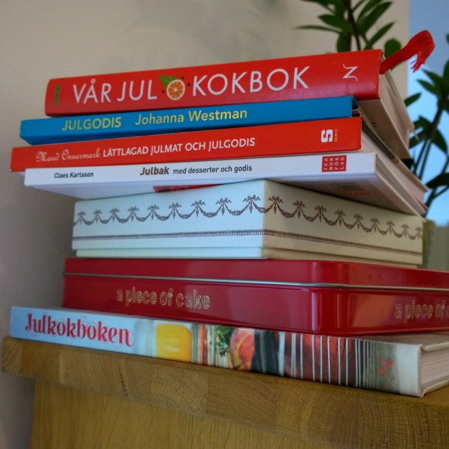 Till  sist, julkokböckerna. Det är liksom ingen idé att plocka bort dem, rätt som det är blir man sugen på nåt juligt och då vill jag ha dem nära till hands! 🙂