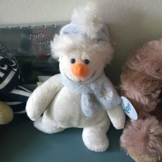 Inne på sonens rum gömmer sig den här lille snögubben i raden av mjukdjur…