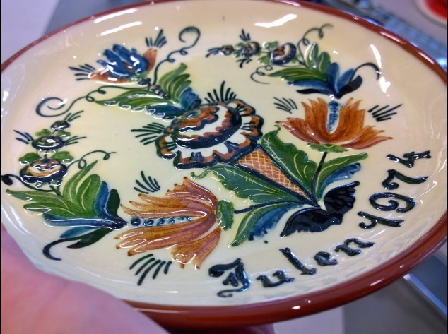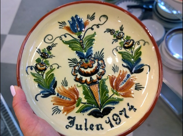 Som den stora fantast av jultallrikar jag trots allt är så blev jag faktiskt förvånad när jag såg den här, jag har aldrig sett nåt liknande förut. Utöver de klassiska blåvita jultallrikarna har jag bara sett några enstaka i färg, men alltid med julmotiv. Förklaringen kom när jag tittade undertill, den var såklart från Nittsjö! Var annars förknippar man kurbits med jul om inte i Dalarna?