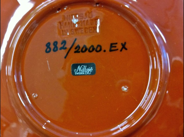 Som den stora fantast av jultallrikar jag trots allt är så blev jag faktiskt förvånad när jag såg den här, jag har aldrig sett nåt liknande förut. Utöver de klassiska blåvita jultallrikarna har jag bara sett några enstaka i färg, men alltid med julmotiv. Förklaringen kom när jag tittade undertill, den var såklart från Nittsjö! Var annars förknippar man kurbits med jul om inte i Dalarna?