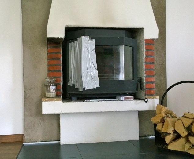 Hade sotaren här idag och han råkade spräcka luckan på kaminen så nu är den tillfälligt fixad med silvertejp. Sådär snyggt och inte det minsta mysigt. 😦