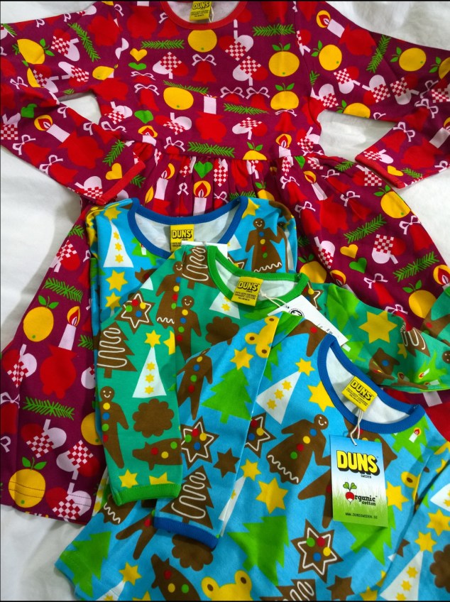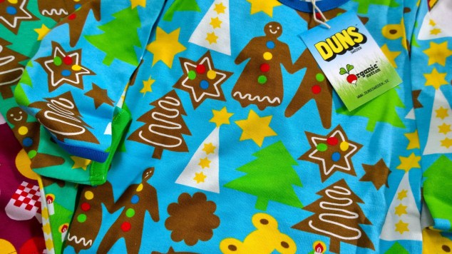 Tjock och mjuk härlig bomullstrikå (ekologisk dessutom!), snygga och välsydda modeller och mönstret på tygerna sen, jag fullkomligen ÄLSKAR dem!!! Spana in detaljerna på pepparkakorna på de blå och gröna tröjorna t ex! Kolla ”kristyren” och ”chokladlinserna” på pepparkakorna! Eller stjärngossestrutarna för den delen..