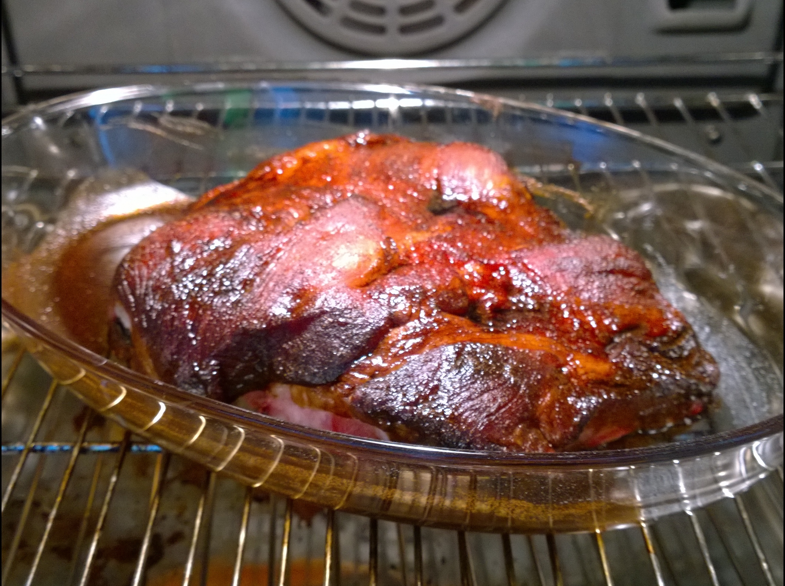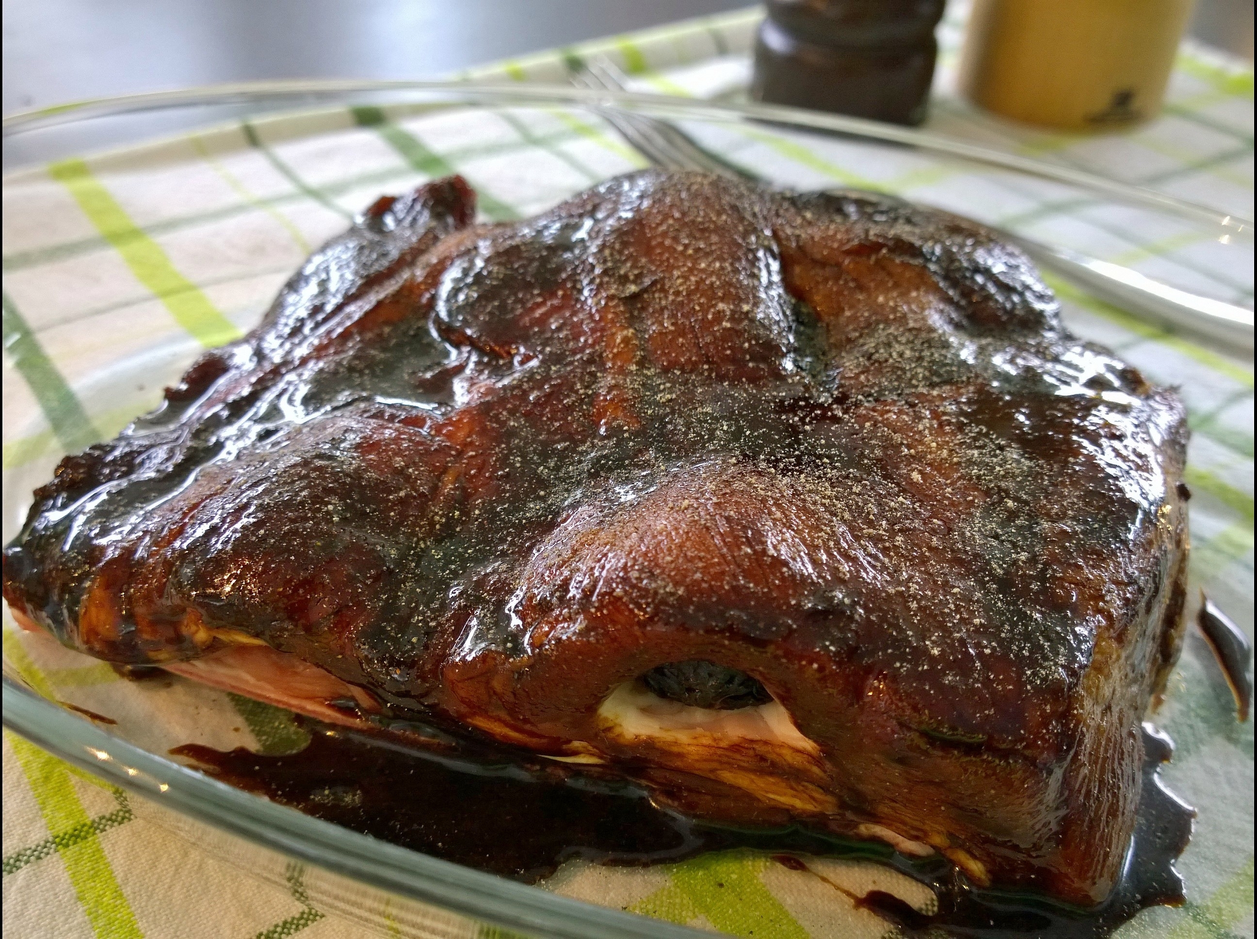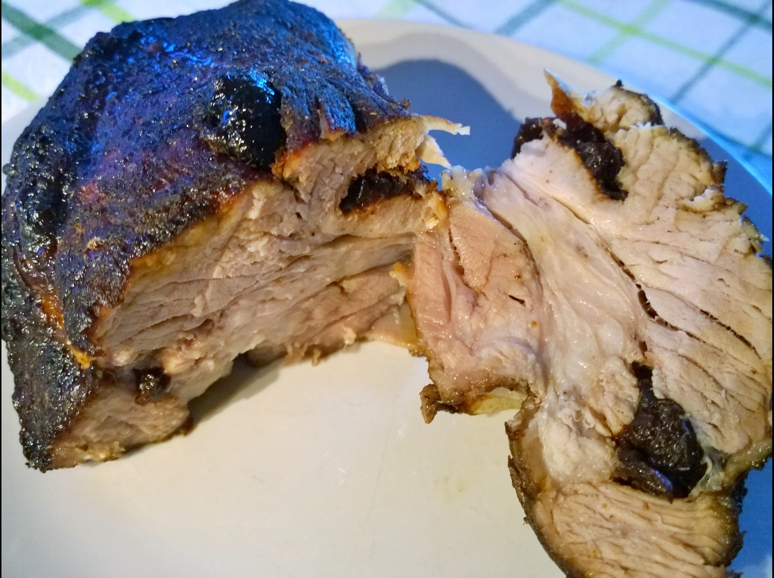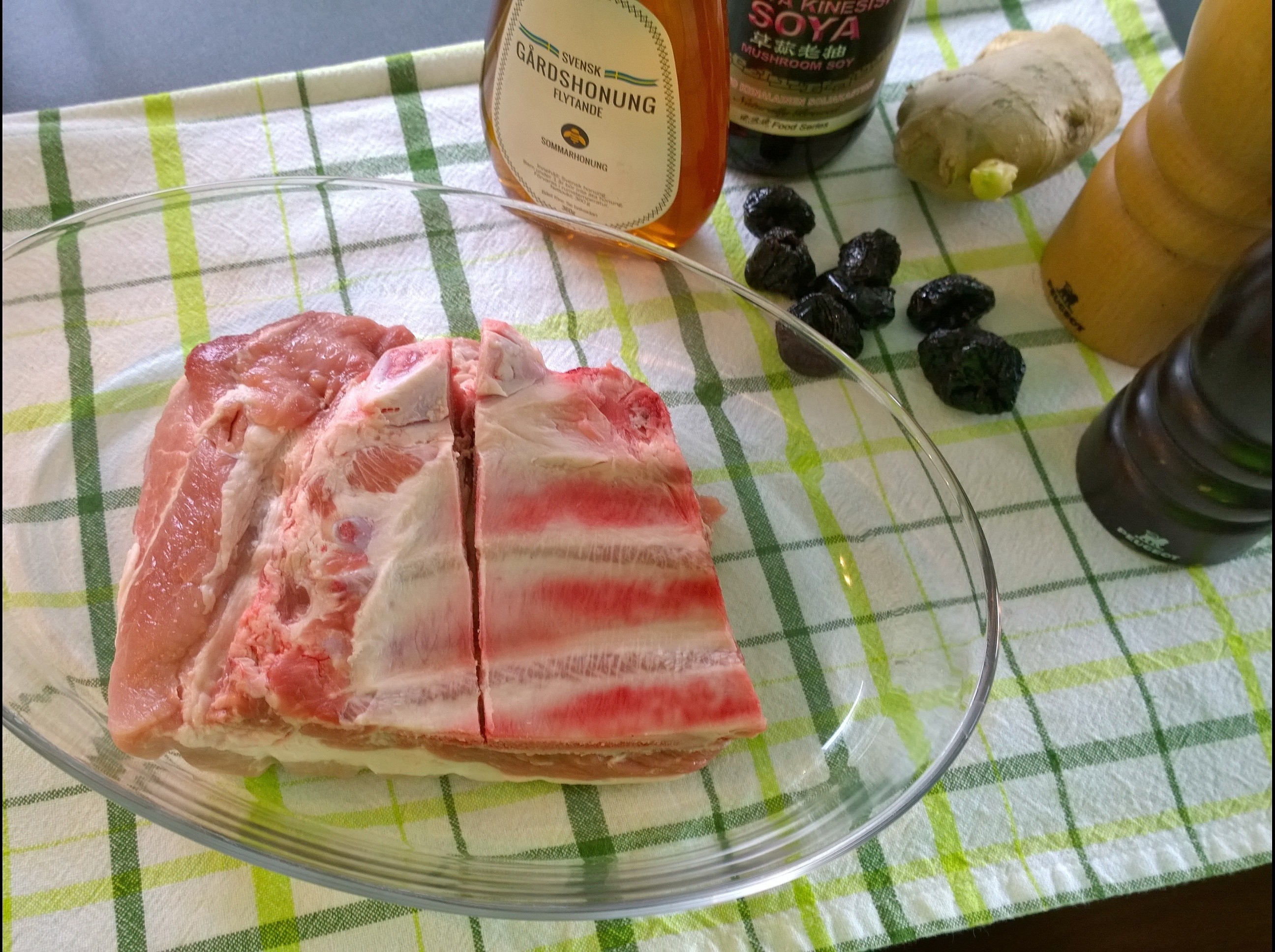 Receptet var väldigt enkelt, revben, katrinplommon och 2 msk vardera av soja, honung, ingefära och fänkålsfrön. Knöka in plommonen i köttet och blanda sen ihop kryddorna och gnid in köttbiten med geggan!