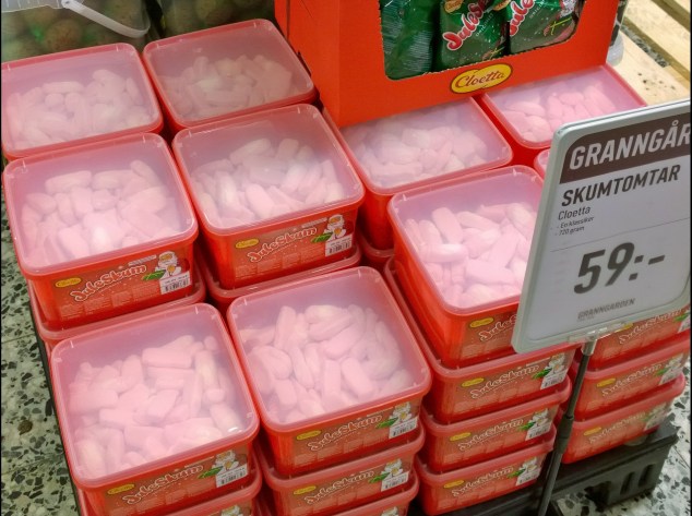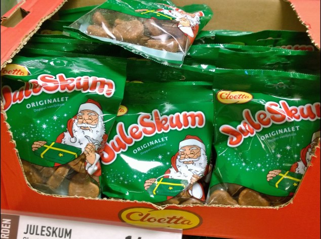 Vid kassorna hittade jag lådor med Juleskum Original och påsar med den chokladdoppade varianten.