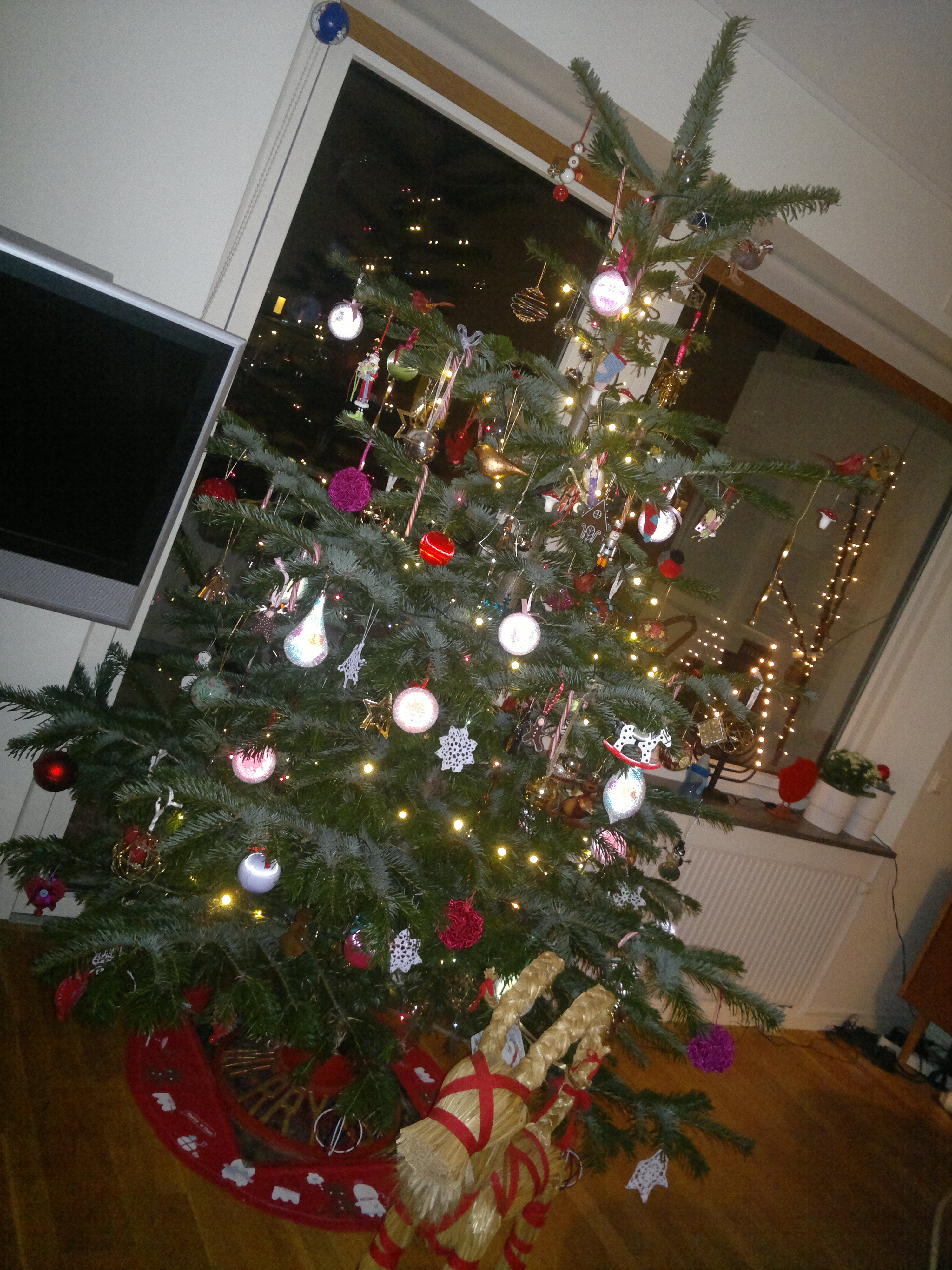 Och det ser ju faktiskt ut som om vi fick till en skapligt dekorerad gran ändå med hjälp av de kulor och dekorationer vi redan hade som tål att trilla i golvet! Kanske inte min drömgran, men jag slipper i alla fall stänga in vare sig gran eller barn, alternativt gå omkring på helspänn med hjärtat i halsgropen och oroa mig för när han kommer dra ner nån kula som kommer att gå i tusen skärvor…