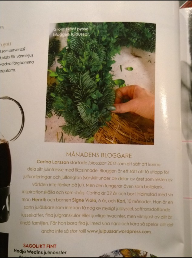 En kul överraskning i Lantliv! 28 oktober, 2015Julpussar Inte nog med att man får en hel extra tidning med julnumret av Lantliv som bara innehåller inspiration och idéer… …Julpussar råkar dessutom vara månadens blogg i aktuellt nummer (julnumret)! 😊 Dela det här: Klicka för att dela på X (Öppnas i ett nytt fönster) X Klicka för att dela på Facebook (Öppnas i ett nytt fönster) Facebook Gilla Laddar in … Relaterade