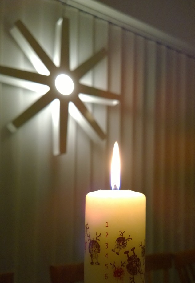 Årets kalenderljus har nu varit tänt i lite drygt en timme och det syns knappt! Hur ska vi hinna ligga i fas med det här..?