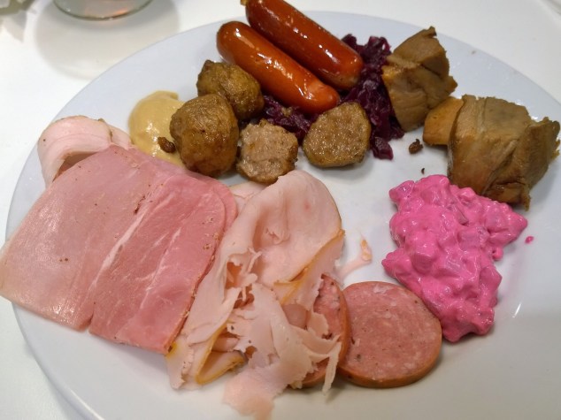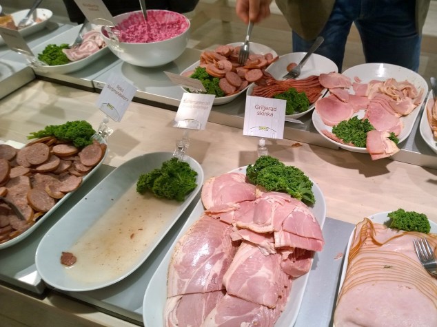 Ikväll var jag sugen på julmat men orkade inte ställa mig i köket och laga nåt, vad gör man då? Jo, man packar in familjen i bilen och kör till Ikea! 129 kr/person för Familymedlemmar (och 19 kr för barn) känns mer än ok! Det är kanske inte världens största utbud, men det viktigaste finns där; ett par sorters sill och lax, ägghalvor, lite kallskuret (inklusive skinka), ett varmt bord med köttbullar (såklart!), prinskorv, revben, kål och Janssons samt ett gottebord med småländsk ostkaka, ris a la Malta och pepparkakor. Jag blev både mätt och belåten!