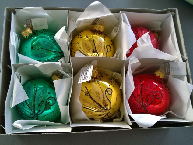 Inne på Illum hittade jag den här fina asken med handdekorerade julgranskulor i glas till 70% rabatt! 🙂 Och låt er inte luras av bilden, de är stora, 80 mm i diameter och gjorda i sådär riktigt tunt och skört glas som gamla kulor brukar vara gjorda i.