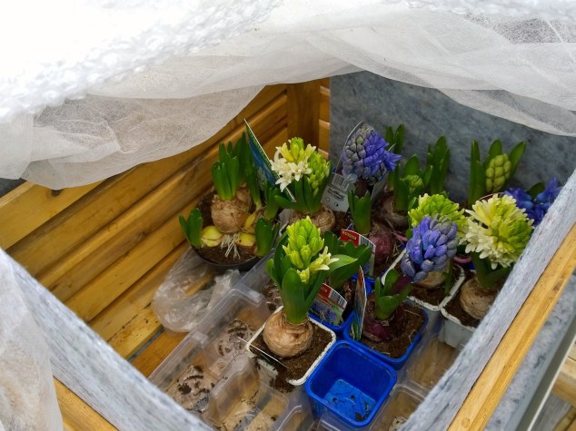 Här, under ett par lager fiberduk och bubbelplast står de sig bra. Kylan gör att de stannar av lite i utvecklingen (lite som att trycka på en pausknapp) och fiberduken och bubbelplasten skyddar mot oväntade frostnätter (vi har fortfarande bara ”höst” temperaturmässigt här i söder).. Perfekt att bara kunna plocka in hyacinter efterhand som de blommar över inomhus!