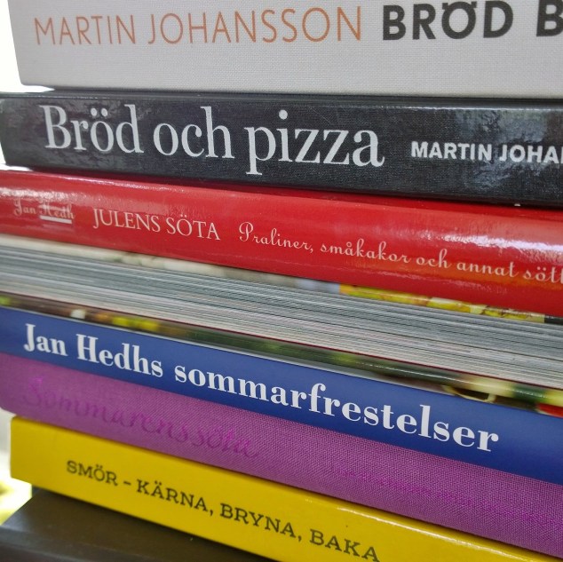 I köket ligger det en hög med kok- och bakböcker, och tro sjutton! Är det inte en röd julbok som skymtar där mitt i högen..?
