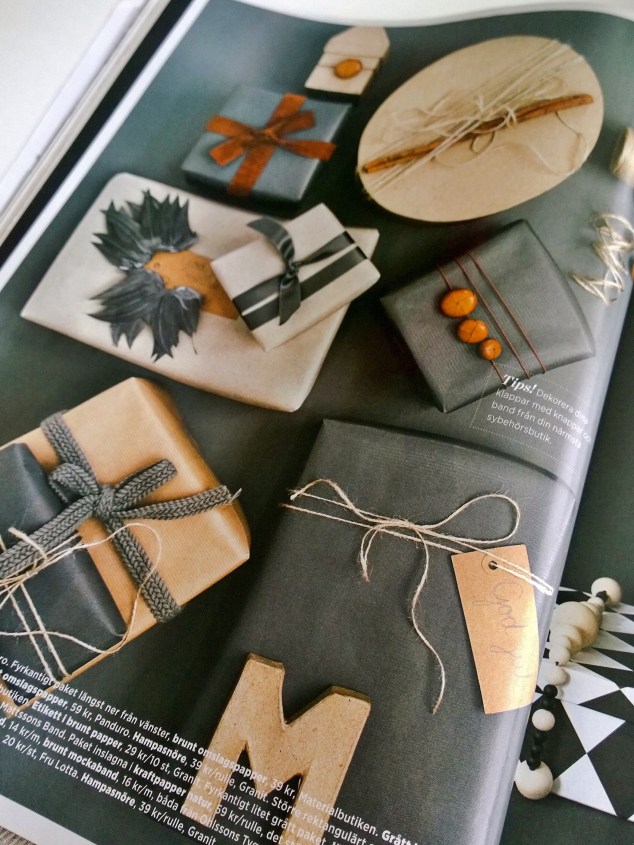 Nu i helgen fyndade jag ett julnummer av Plaza interiör från 2012 för en femma och igår kväll bläddrade jag igenom mitt kap… Det var kanske inte det mest juliga av alla julnummer, men ett och annat guldkorn lyckades jag ändå skrapa fram! Jag gillade t ex de här naturinspirerade paketinslagningsidéerna! Inte riktigt så juliga som jag vill ha dem kanske, men det är ju lätt åtgärdat med t ex ett rött snöre eller en liten grankvist..
