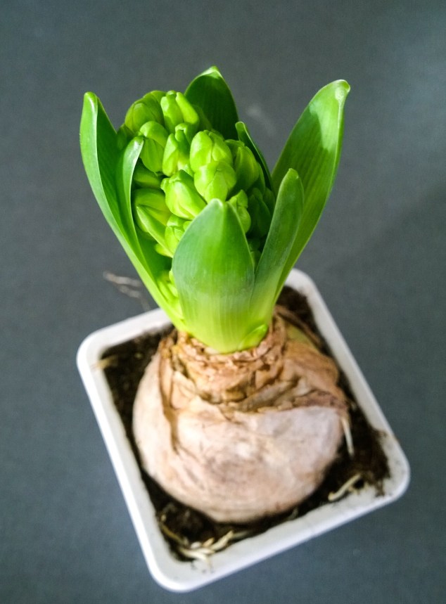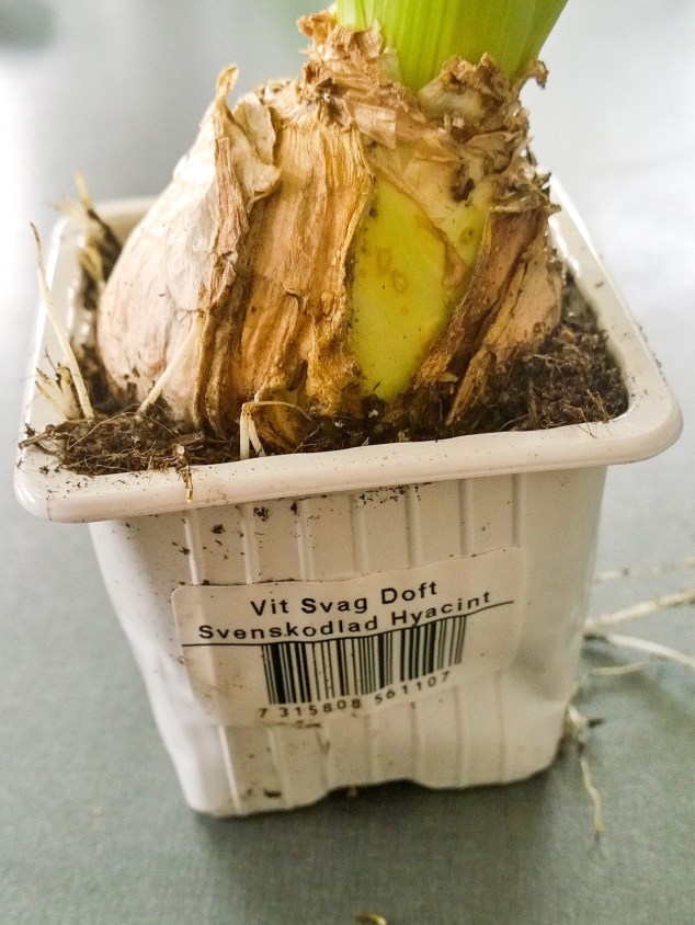 Första hyacinten för den här julen är in da house! 🙂 Det blev en svenskodlad vit liten skönhet med svag doft (har en allergisk äkta hälft).. Hoppas den slår ut snart nu när den fått komma in i värmen!