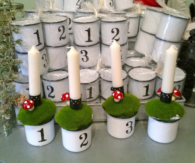 En väldigt enkel men fantastiskt söt variant på adventsljusstake! Emaljmuggar, kuddmossa, några svampar och så ljusen då… 🙂