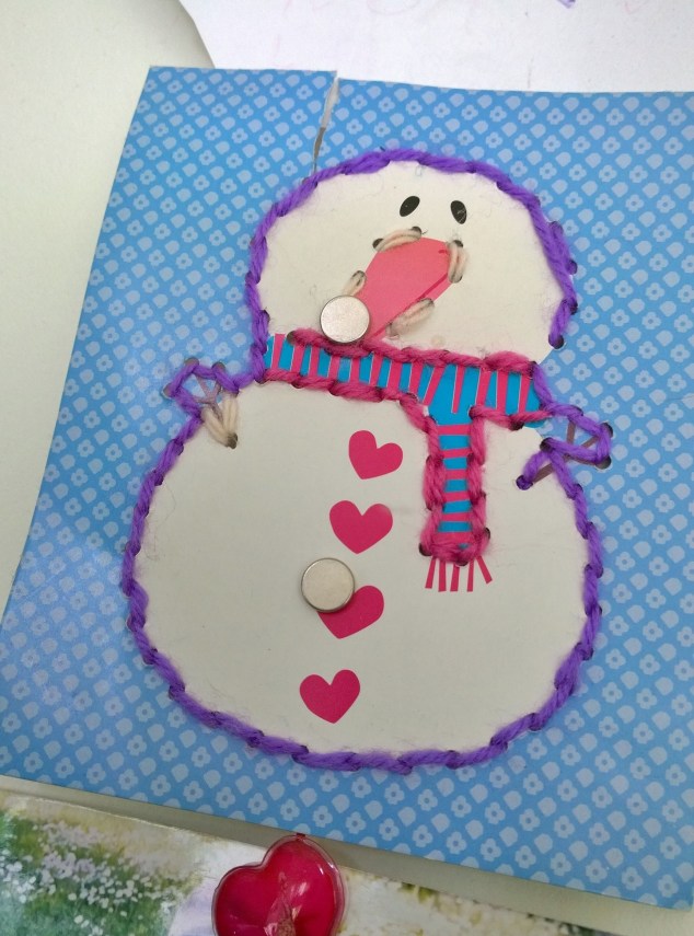 Dotterns fina snögubbekort sitter visst kvar på väggen i hallen i år också..