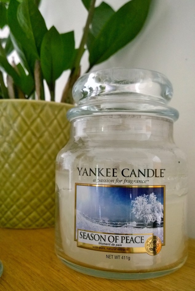 Och strax intill står ett doftljus med en minst sagt vintrig etikett; SEasons of Peace från Yankee Candle.