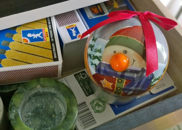 Den här söta julgranskulan med snögubben är en souvenirgåva som inte riktigt hittat hem till de andra julkulorna än, så tills vidare samsas han med tändstickor, ljusstakar och stearinljus i en byrålåda! (Är han förresten inte lite lik snögubben i filmen the Snowman..?)