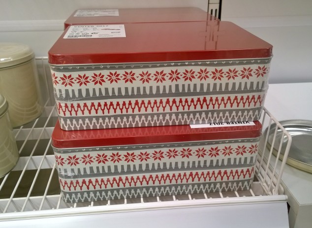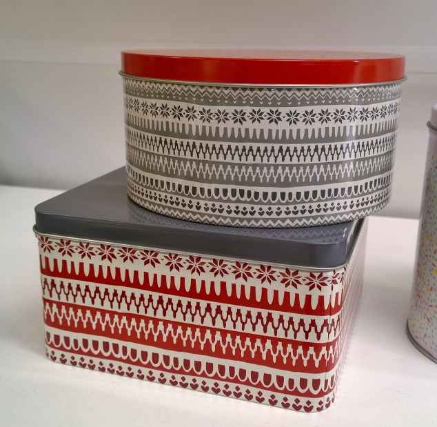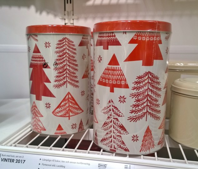 I år ska jag verkligen försöka låta bli att dras med i köphetsen som lätt uppstår kring jul. Vi har ju redan mer än vi behöver i julpyntsväg och jag vill gärna tänka hållbart och miljövänligt när jag konsumerar, även om det är mycket fint som lockar på julavdelningarna… De här fina plåtburkarna t ex, det var riktigt nära att de slank med i min stora gula kasse innan samvetet sa stopp. Jag har ju redan fler plåtburkar än jag behöver..