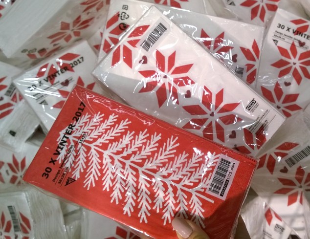 Det blev en utflykt till Ikea i helgen också, och där hade de minsann hunnit plocka fram julen! Redan på köksavdelningen fanns där gott om juliga detaljer; fina plåtburkar, textilier, baktillbehör, porslin & servetter! Men jag lyckades hålla mig i skinnet, det enda juliga som följde med hem var de här fina röda servetterna med granmotiv på.