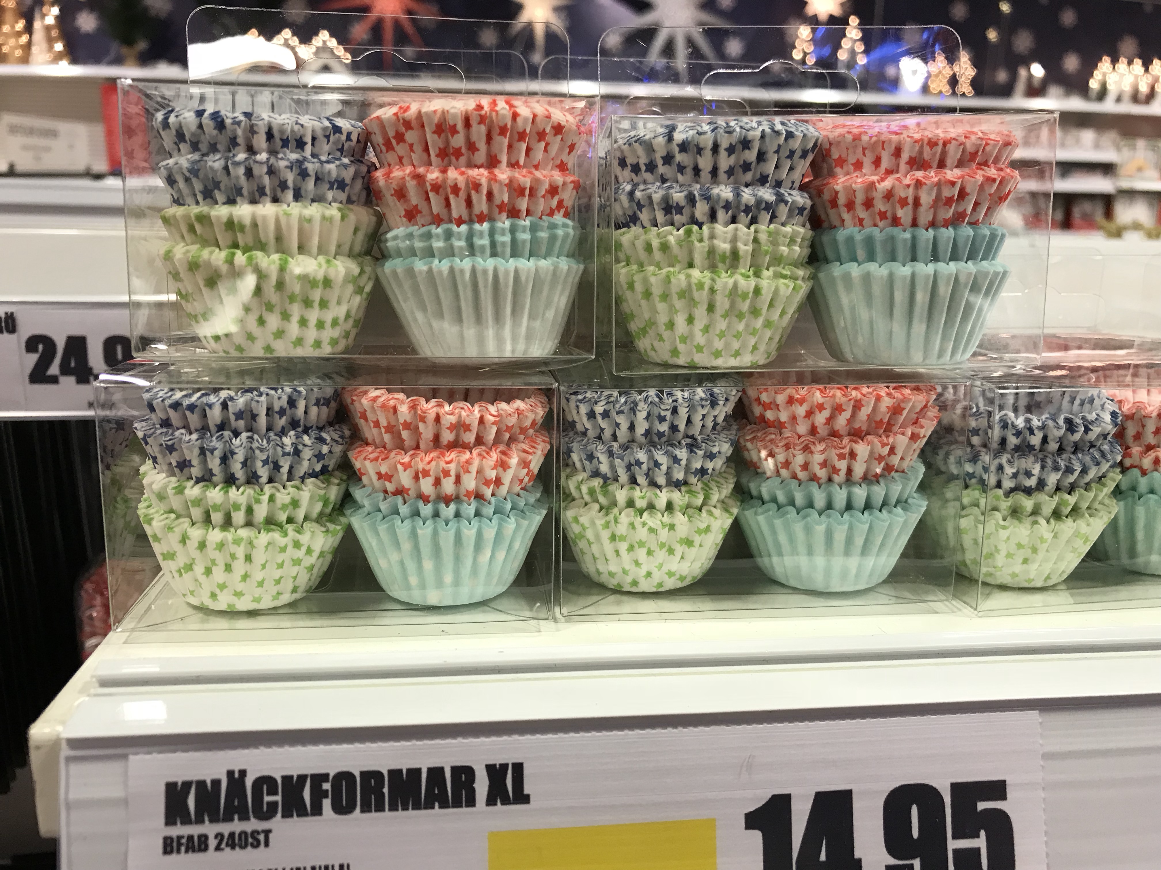 Ganska söta med sina fina färger och stjärnmönster, men jag kan inte låta bli att undra hur tänkte man här egentligen? Knäck i sig är ju en ganska otymplig godbit att äta tycker jag. Den går ju liksom inte att dela eller ta en liten bit av, utan man måste ju verkligen ha in hela den där hårda och sega knäckklumpen i munnen på en gång. Förstå mig rätt nu, jag älskar knäck! Men den känns stor nog som det är i en vanlig knäckform, vill man då verkligen ha in en knäck i storlek XL i munnen? För de var ganska stora de där formarna, snudd på minimuffins i storlek skulle jag säga…