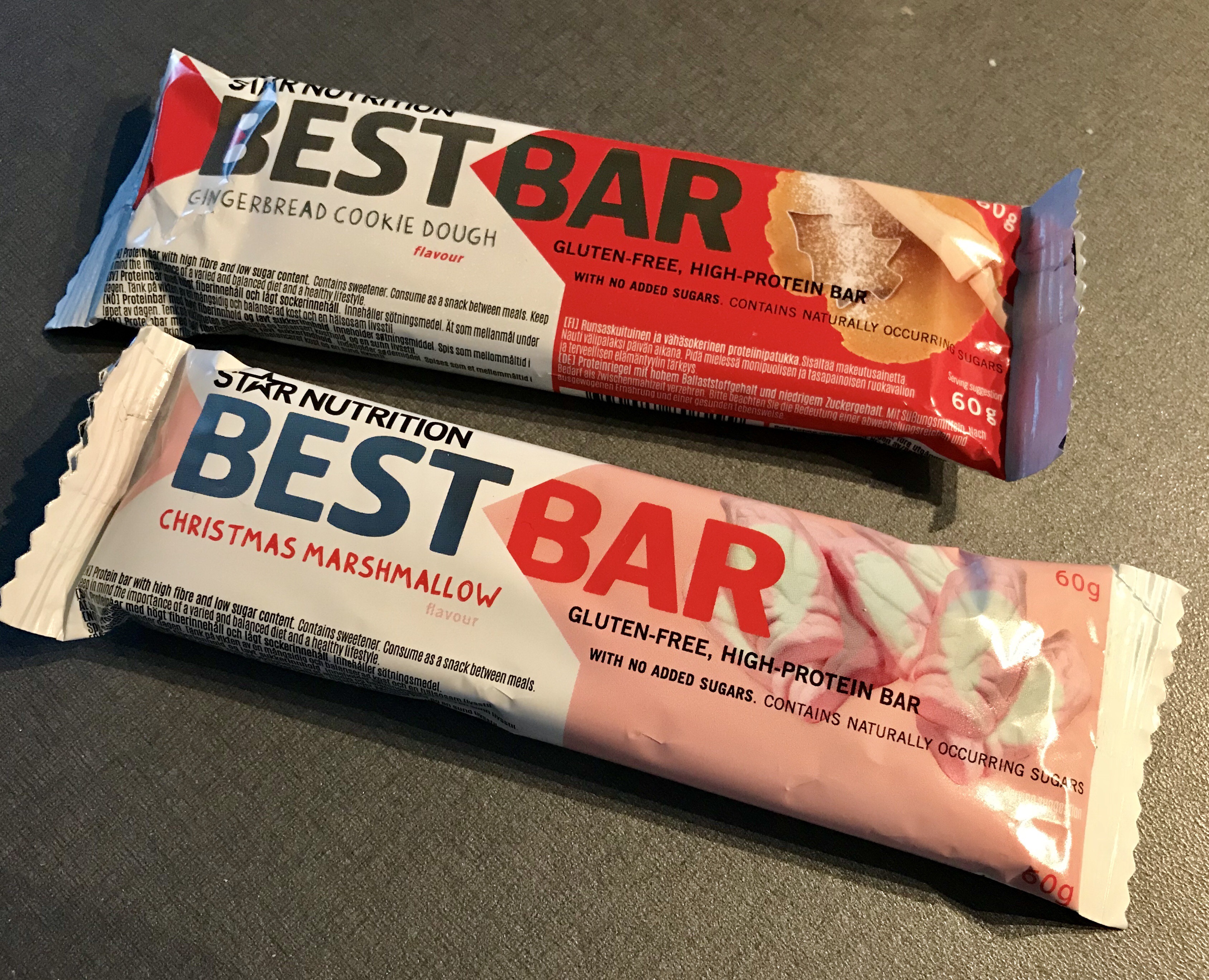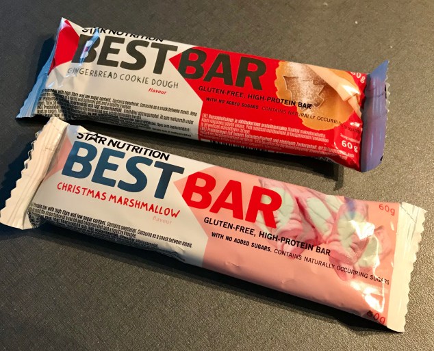 När jag var och skulle fylla på förrådet senast så hittade jag de här två juliga varianterna som jag naturligtvis inte kunde låta bli; Best Bar från Star Nutrition med smak av pepparkaksdeg respektive skumtomte! Bägge var förvånansvärt goda får jag lov att säga, ibland brukar godissmakande bars ha en lite syntetisk och nästan parfymig bismak liksom men bägge de här gick hem hos mig!