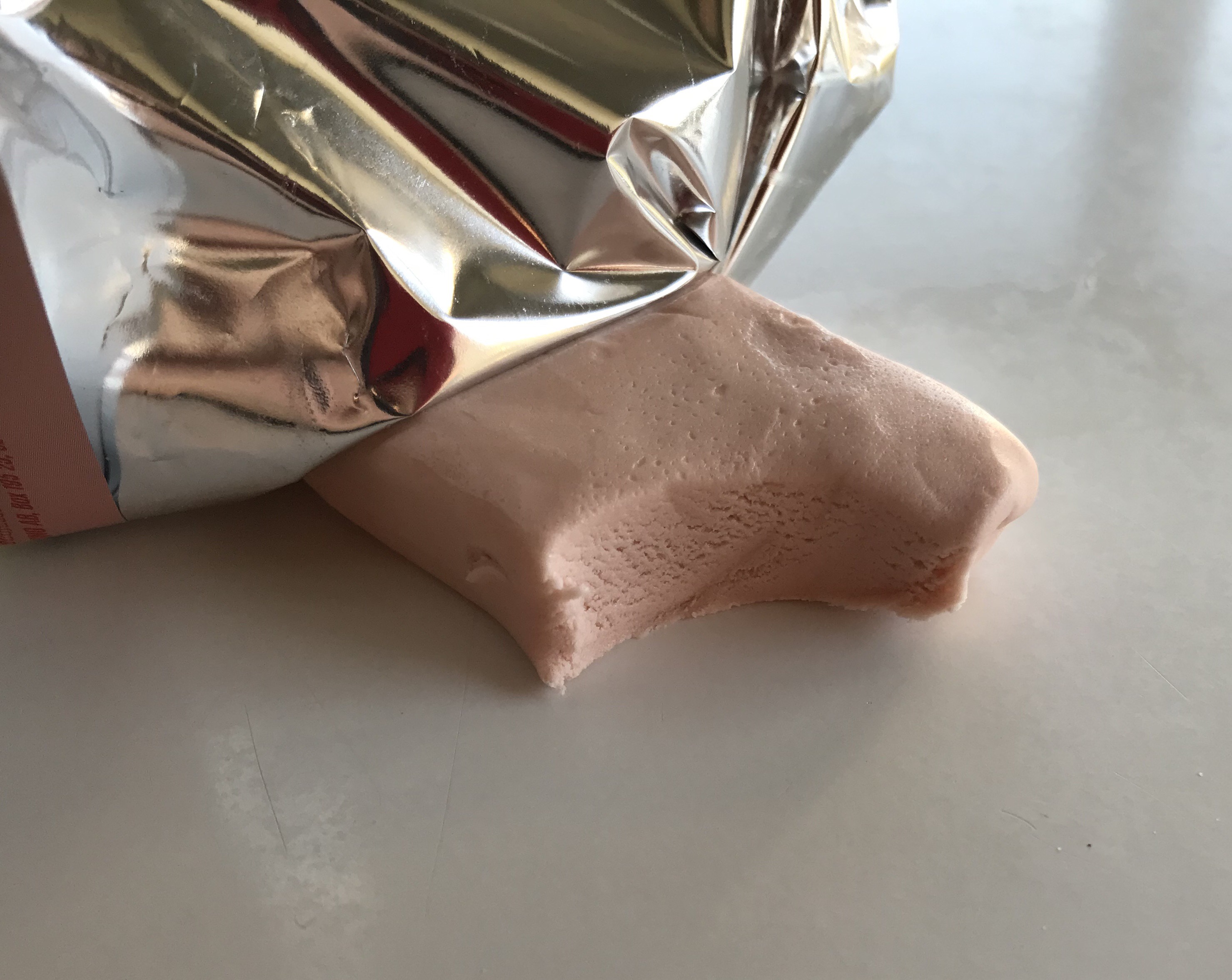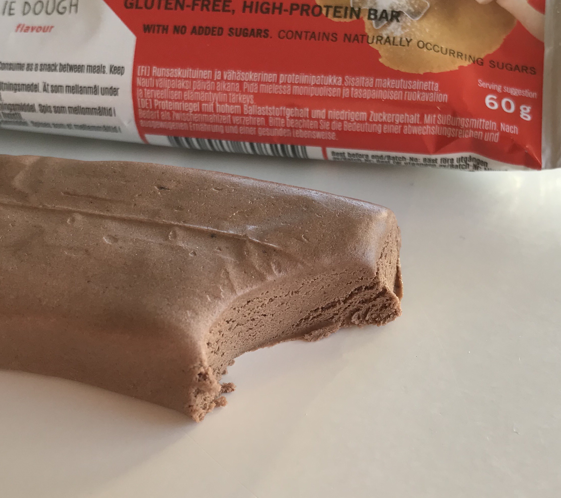 Den med smak av pepparkaksdeg ser väl inte så värst aptitlig ut (men gör pepparkaksdeg det nånsin förresten?), men både smak och konsistens känns faktiskt som pepparkaksdeg. I ett blindtest hade jag nog inte kunnat avgöra skillnaden mellan en ”köpedeg” och den här proteinbaren vilket väl får anses vara ett bra betyg!