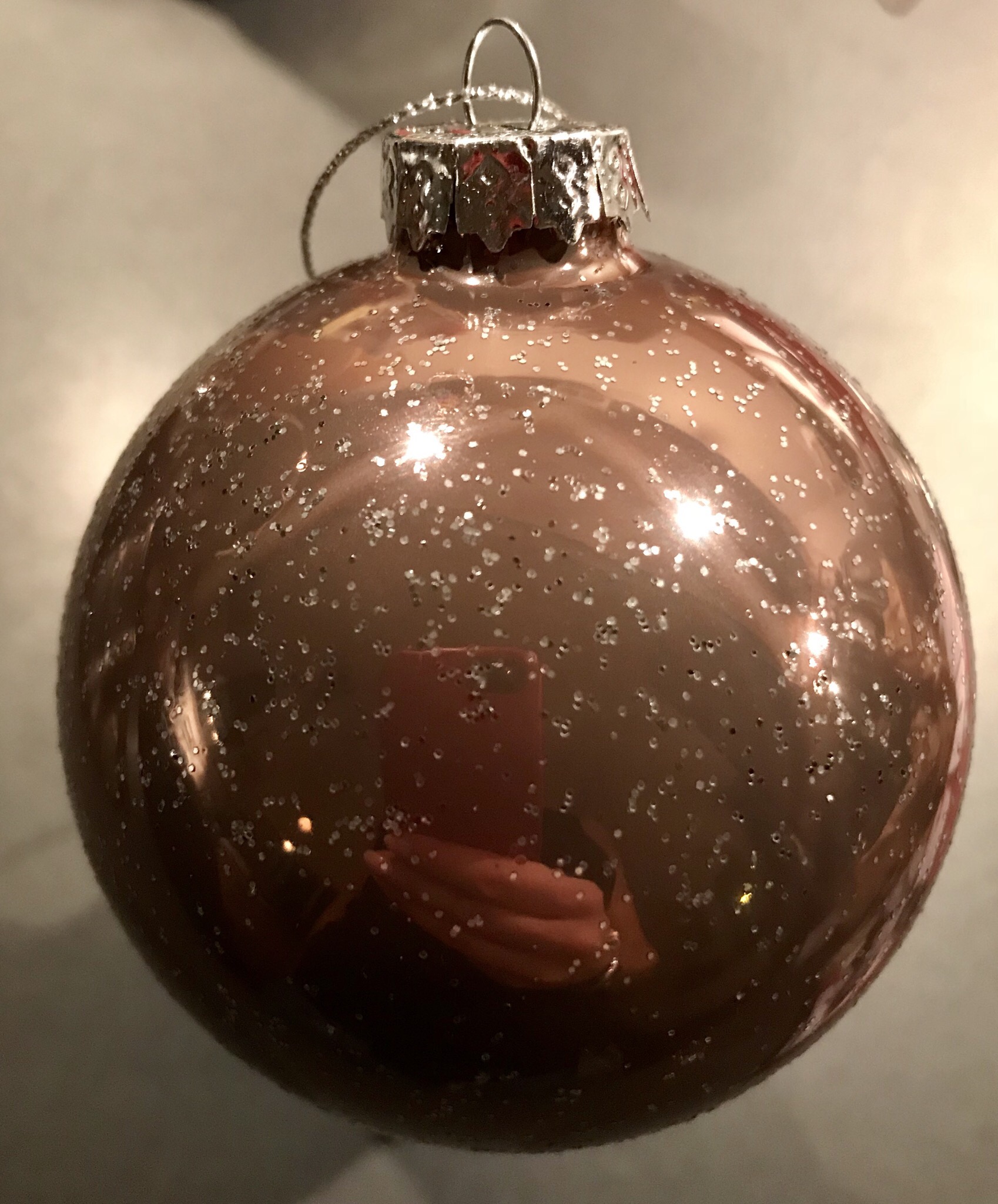 En ny julgranskula, men en riktigt fin en! Svagt kopparfärgad i glas och strösslad med silverglitter…