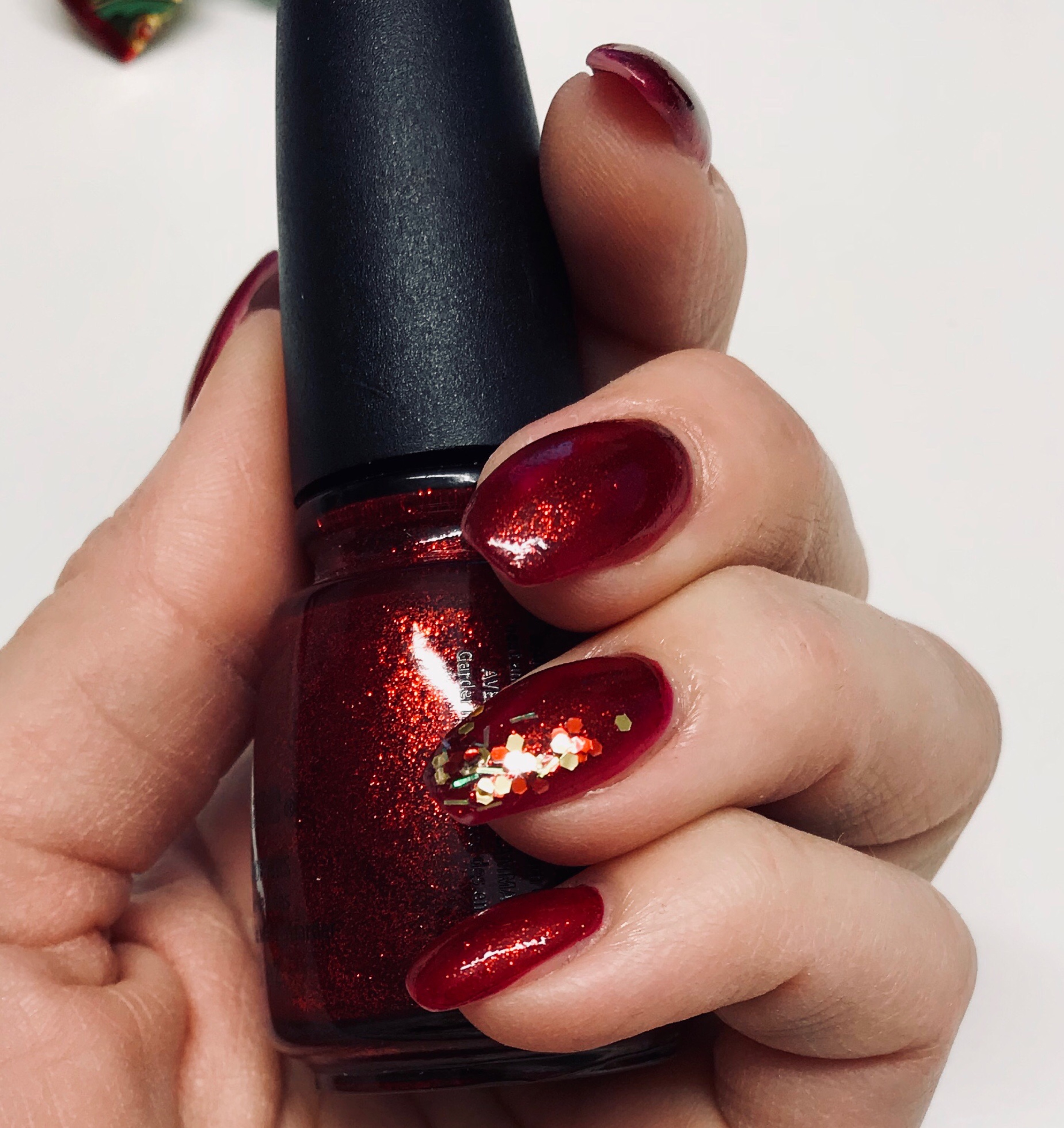 Kände att det var dags för lite julfina naglar såhär veckan innan jul! Letade upp ett gammalt rött glittrigt nagellack i gömmorna och pimpade det med lite glitter! Får se hur länge jag låter det sitta kvar. Blev lite sugen på att prova både det guldiga och det gröna lacket jag köpte samtidigt (för typ fyra år sen, den som spar hon har!).. 🙂